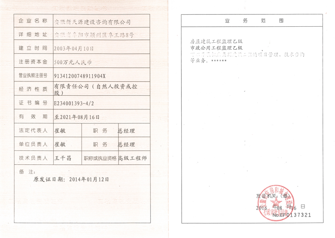 安徽新天源建設咨詢有限公司是一家全過程項目管理咨詢機構,重點開展PPP項目咨詢、BIM項目咨詢、招標代理、工程造價、工程監理、工程咨詢等業務。 公司成立于2003年4月10日,為股份制企業,現注冊資金5000萬元,辦公面積2200多平方米,法人代表崔敏。在成立同年,公司取得了國家發展改革委員會頒發工程咨詢資格證書,并成為安徽省工程咨詢協會會員單位。隨著近年來的不斷發展壯大,公司相繼取得了招標代理資質證書(工程招標代理資質資格證書、政府采購代理資格證書、水利工程招標代理資格證書、中央投資項目招標代理資質證書)。 2008年11月取得工程造價資質證書并成為阜陽市審計局審計協審定點單位; 2012年3月取得安徽省發改委固定資產節能評估資質證書; 2012年3月取得安徽省國土資源廳測繪資質證書; 2012年7月獲得安徽省經濟和信息化委員會第一批工業投資項目節能評估機構備案; 2012年9月取得水利工程監理資質證書; 2014年1月取得工程監理資質證書;現工程招標代理及工程造價已取得甲級資質,并開展了環境影響評價、工程測量、房地產評估等業務。